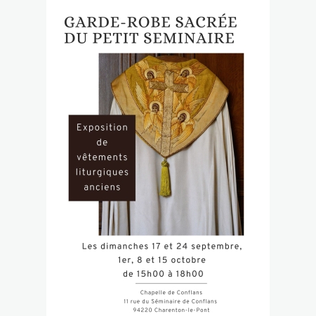 A l'occasion des Journées européennes du Patrimoine, la paroisse Saint-Pierre de Charenton organise une exposition de vêtements liturgiques anciens à la chapelle de Conflans. Elle sera visible le dimanche 17 septembre de 14h00 à 18h30.